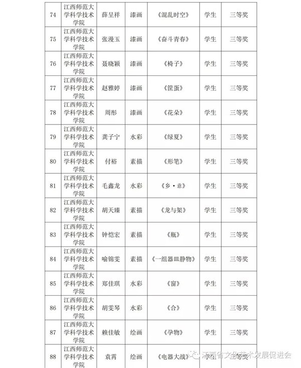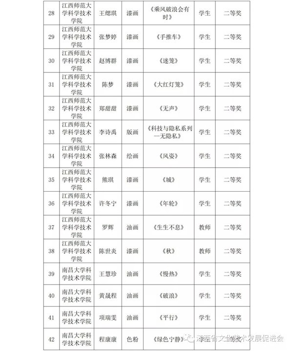 共青城市各院校: 为了推动共青科教城美术教育的发展,歌颂以爱国主义为核心的伟大民族精神,科教城将通过展示近年来美术、书法创作教学的成果,激励全体师生紧密团结在以习近平同志为总书记的党中央周围,为实现中华民族伟大复兴的中国梦、为不断开创“发展升级、小康提速、绿色崛起、实干兴赣”新局面而努力奋斗,以优异的成绩迎接新中国成立70周年。6月25日在江西师范大学科学技术学院美术馆举办了共青科教城举办“首届共青科教城师生美术、书法优秀作品展”。本次展览面向共青科教城的高校师生征集,共收到中国画、油画、版画、水彩水粉画、漆画、插画、书法作品348件,经专家评审,共评选出优秀组织单位奖2个,一等奖20个,二等奖40个,三等奖73个,优秀指导老师23名。现将获奖情况予以通报。 |