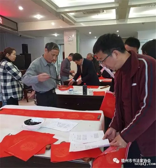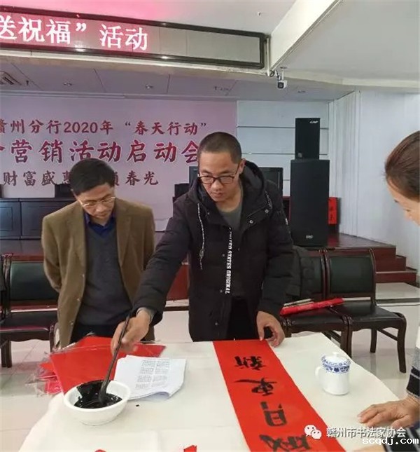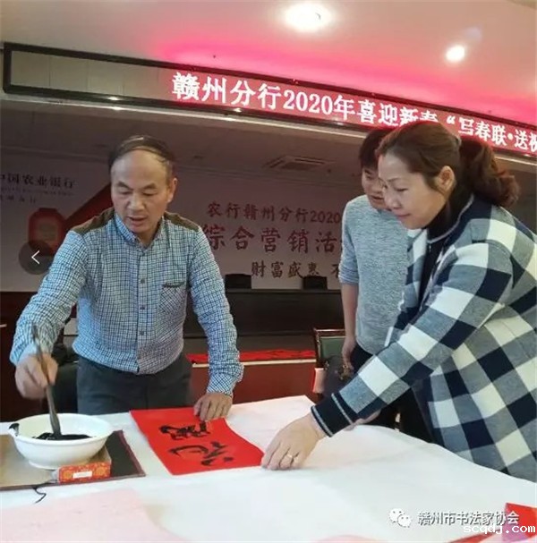 世泰丰收景,民安幸福年,为深入学习贯彻习近平新时代中国特色社会主义思想和党的十九大精神,落实中宣部《关于学习贯彻习近平总书记重要指示精神 做新时代“红色文艺轻骑兵”的通知》要求,丰富人们春节文化生活,营造浓厚的节日氛围,满足人们节日文化需求,2020年1月3日,赣州市书协组织书法家深入生活,走进农行,泼墨挥毫,书写春联福字,计600余幅,深受企业员工好评。参加活动的有赣州市书协顾问李安华、赣州市书协主席张声林、副主席郑人凤、李秀忠、秘书长刘小明、赣州书法篆刻研究院院长欧阳斌。 |