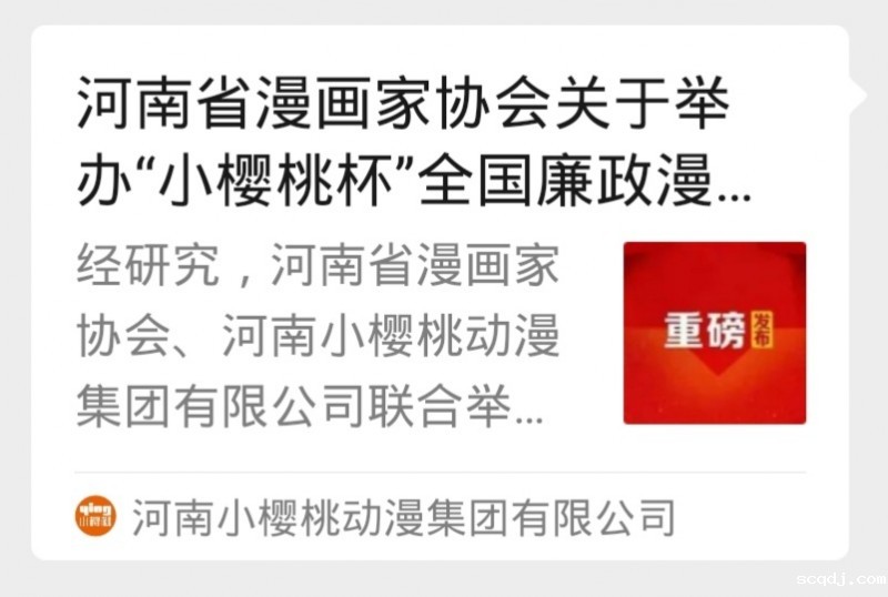 河南省漫画家协会关于举办“小樱桃杯”全国廉政漫画、招贴画创作月赛的公告(第一号) 河南小樱桃动漫集团有限公司 昨天 经研究,河南省漫画家协会、河南小樱桃动漫集团有限公司联合举办“小樱桃杯”全国廉政漫画、招贴画创作月赛,3月份的创作主题是“建设好家风”,引导党员、干部修身律己、廉洁齐家,3月7日截稿。现将赛事有关事项公告如下: 一、赛事组织机构 主办单位:河南省漫画家协会。 承办单位:河南小樱桃动漫集团有限公司。 协办单位:国家动漫产业发展基地(河南基地)管委会、河南省动漫产业协会。 作品评选委员会由河南省漫画家协会在协会评委库中遴选专家组成。 二、时间安排 作品征集:2020年3月1日至7日;颁奖:2020年4月上旬。 三、赛事活动安排 (一)单项比赛 1.“小樱桃杯”全国廉政漫画创作月赛(3月赛事)。 2.“小樱桃杯”全国廉政招贴画创作月赛(3月赛事)。 (二)赛制安排 本次单项比赛分别评奖,获奖作品纳入第六届“天地之中杯”全国廉政漫画、招贴画创作大赛参加终评。 四、奖项设置和奖励办法 漫画、招贴画各设金奖1名,奖金2000元,银奖2名,奖金1000元,铜奖3名,奖金500元,提名奖5名,奖金300元。获奖作品由河南省漫画家协会、河南小樱桃动漫集团颁发获奖证书和奖金。获奖作者优先成为河南小樱桃动漫集团签约漫画家、设计师。 五、参赛范围 廉政漫画面向全国漫画家征集作品,廉政招贴画面向全国专业设计师和高校视觉传达、艺术设计专业师生征集作品。 六、参赛须知 (一)参赛作品须具有鲜明的思想性、艺术性和独特创意,积极向上、贴切家风主题、凝聚正能量、弘扬真善美,参赛作者需拥有自主知识产权,必须是未发表作品。 (二)作品格式:漫画作品单幅、四格、条漫均可,招贴画表现形式不限。作品须为jpg格式(手绘作品应扫描或拍照成电子版报送),竖幅作品优先。 (三)主办方对所有参赛作品拥有但不限于以下使用权:以任何形式、在任何载体进行发表、发布、传播、出版、展览。 (四)每人选送作品不超过两件,赛事进展可通过“河南动漫”微信公众平台查看。 七、作品提交及联系方式 (一)参赛作品必须通过电子邮件和纸质信件两种形式提交,必须填写参赛报名表中的所有内容,与作品原图一起打包压缩,以“小樱桃杯廉政漫画(或招贴画)月赛+作者姓名”命名发至hnsdmcy@163.com,截稿时间为3月7日晚上10点。报名表请到“河南动漫”微信公众号下载,也可到hnsmhjxh@126.com下载,登录密码是hnsmhjxh888。 (二)邮寄地址:河南省郑州市高新区科学大道53号3号楼9层小樱桃集团“小樱桃杯”全国廉政漫画、招贴画创作月赛办公室,邮政编码:450001。 (三)截稿时间以邮件发送时间为准,3月30日之前未收到纸质报名表,取消参赛资格。 (四)联系人:赵琮鑫, 电话:18103840633 0371-65861272-8907。 附件:参赛报名表 2020年2月29日  |